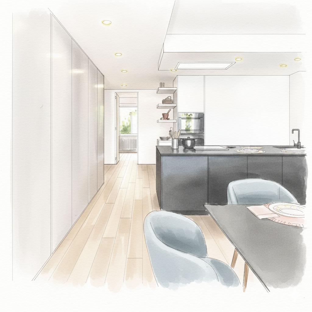 An important aspect of our design is the principle of the open kitchen. The merging of the kitchen and living area creates a truly exceptional sense of space.